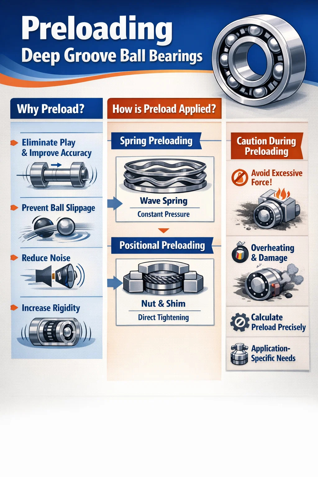 Evite "força excessiva": Se a força de pré-carga for muito grande, o atrito dentro do rolamento aumentará drasticamente, causando rapidamente superaquecimento, fumaça ou até mesmo emperramento. Depende da aplicação: Para itens como ventiladores elétricos domésticos e motores pequenos, a pré-carga da mola geralmente é suficiente; mas para fusos de máquinas-ferramenta de alta precisão, a força de pré-carga precisa ser calculada e controlada com grande precisão.