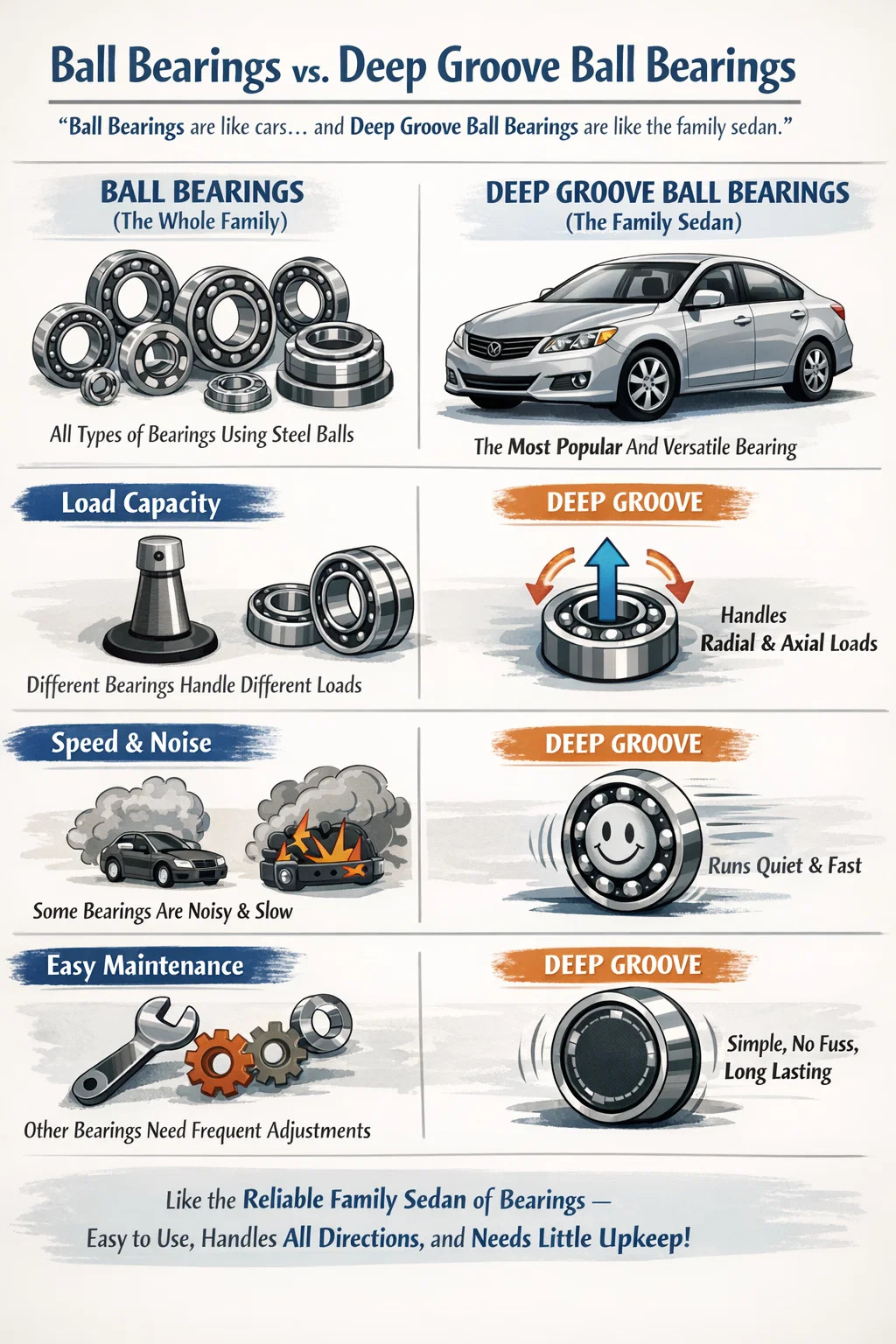 Você pode pensar nos rolamentos de esferas como "carros" e rolamentos rígidos de esferas como o "sedan familiar" mais comum.